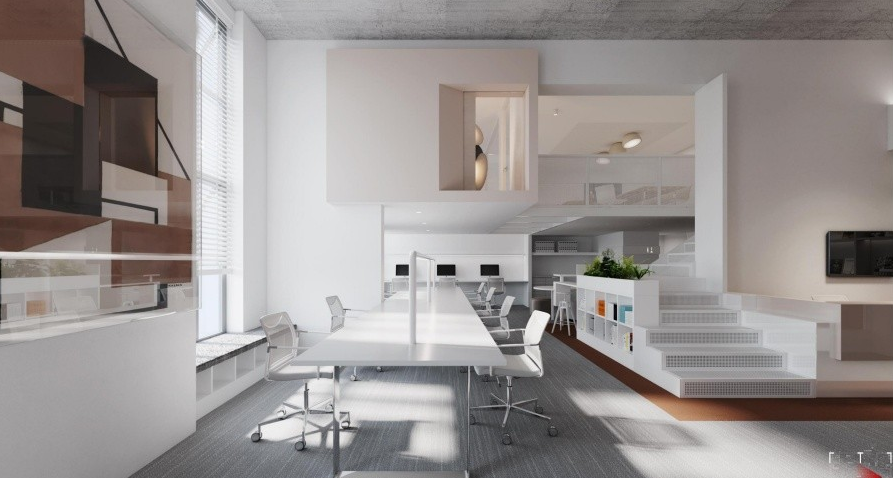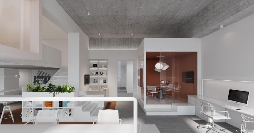 采用簡(jiǎn)潔線條與中性色調(diào)(如白色、灰色),結(jié)合局部色彩點(diǎn)綴(如紅色家具),提升空間現(xiàn)代感與專業(yè)性。